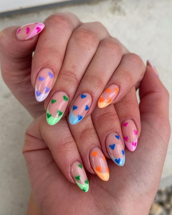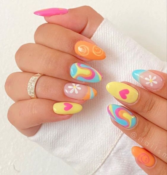 Revel in the enjoyment of summer time with a pleasing array of pastel hues gracefully swirling in combination. Those fascinating almond-shaped nails are a tribute to essentially the most comfortable moments of the season, that includes creamy ribbons of orange, red, yellow, and blue. The comfortable and ethereal sun shades manufacture a flawless and lavish look, radiating inspiration and playful appeal.