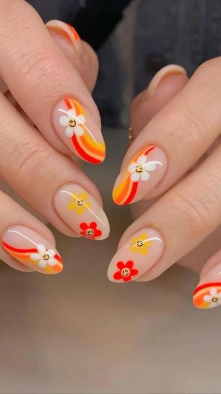Revel in the enjoyment of summer time with a pleasing array of pastel hues gracefully swirling in combination. Those fascinating almond-shaped nails are a tribute to essentially the most comfortable moments of the season, that includes creamy ribbons of orange, red, yellow, and blue. The comfortable and ethereal sun shades manufacture a flawless and lavish look, radiating inspiration and playful appeal.